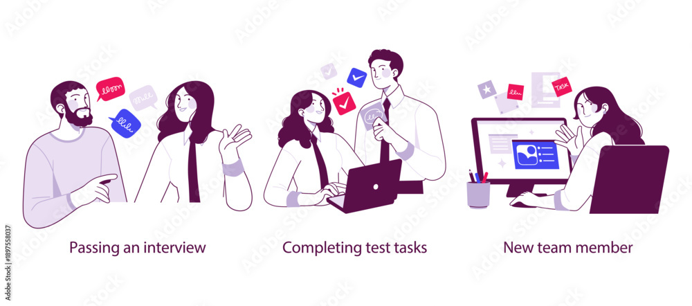 Flat outline illustration depicting key stages of hiring: passing an interview, completing test tasks, and joining a company as a new team member. Represents recruitment, evaluation, and onboarding in #1897558037