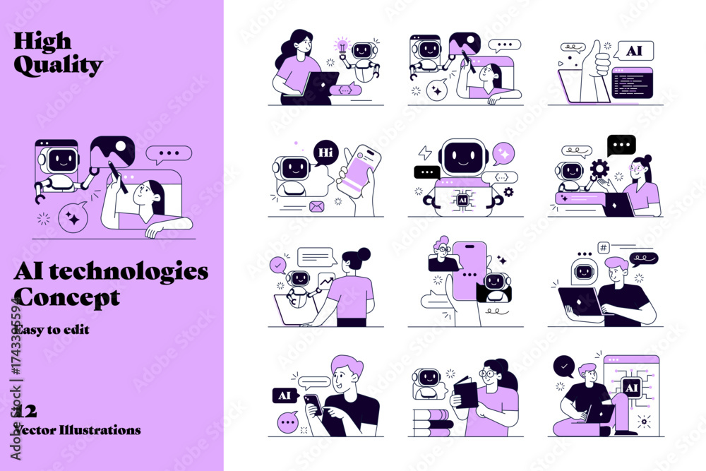 Flat vector illustrations of AI technology, robots, chatbots, and machine learning. Perfect for websites, apps, digital products, presentations, and branding in modern tech themes. Vector #1743395594