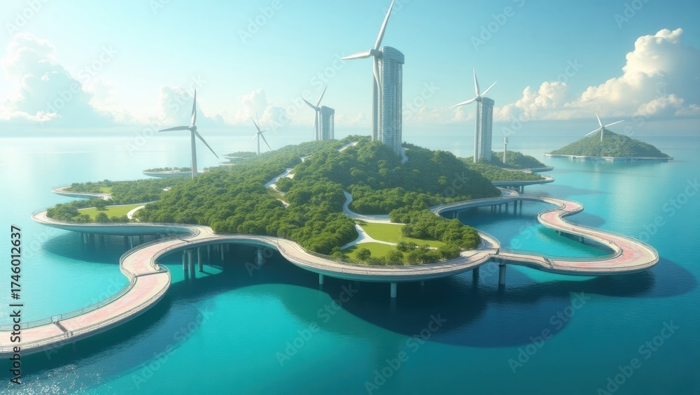 Floating peninsula dotted with spiral turbines and a network of iridescent floating bridges #1746012637