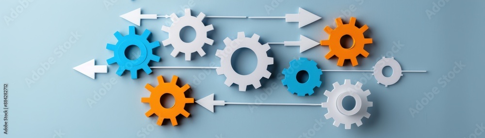 Flowchart with gears and arrows, processing, systematic approach and problem-solving #884282712