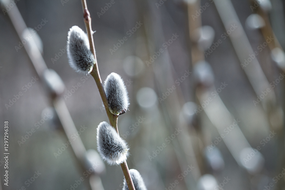 Flowering catkin on willow or brittle willow in the spring forest. Selective focus closeup #1297296318