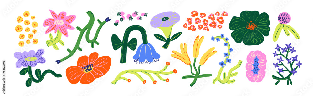 Flowers drawn in modern style. Whimsical doodle floral shapes, blooming plants, scribble blossoms, branches. Creative exotic botanical art. Flat vector illustrations isolated on white background #1968120073