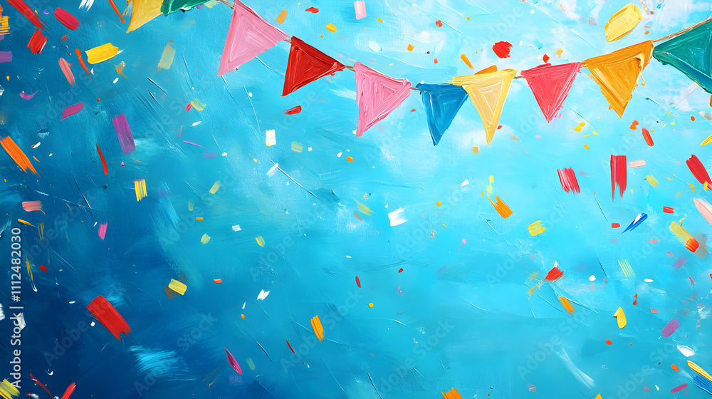 fondo de cumpleaños decorado con banderines y confeti de colores con espacio de copia fondo infantil alegre y colorido #1112482030