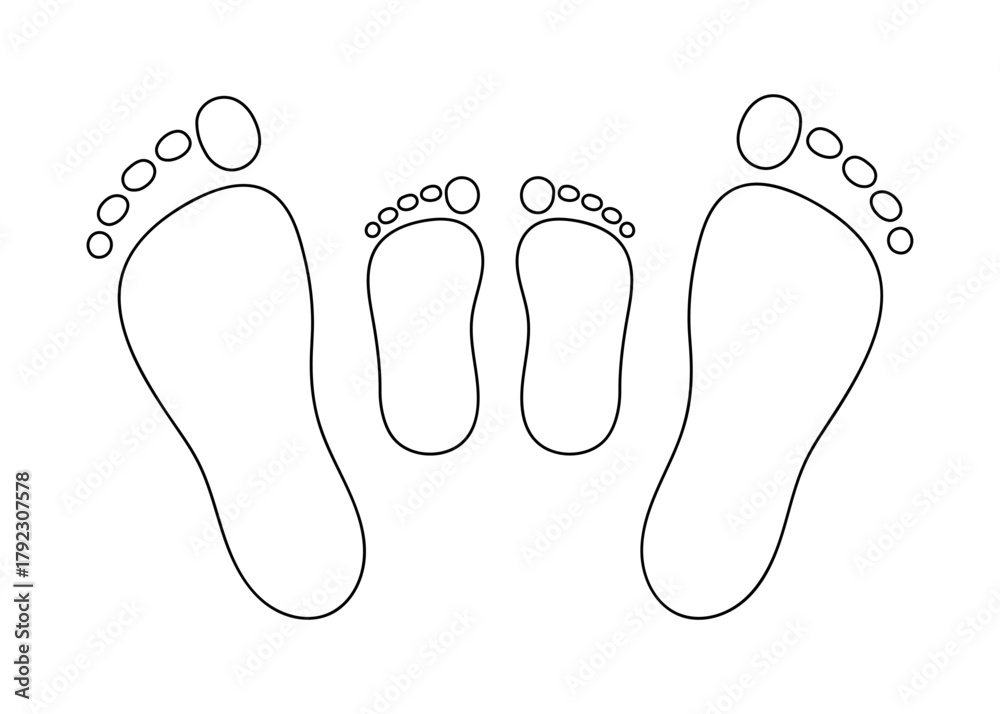 Footprint, leg silhouette adult person and child doodle line drawing. Hand drawn outline bare foot. Vector isolated illustration #1792307578