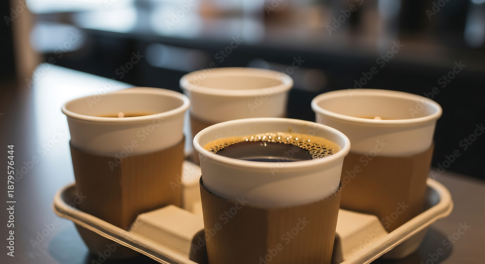 Four disposable coffee cups on a tray, filled with espresso, on a table in a cafe from a close-up viewpoint. #1879576444