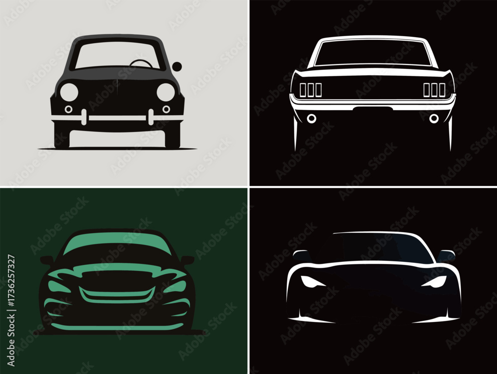 Four distinct car silhouettes highlight automotive design. Each vehicle represents a different era, showcasing the evolution of style and engineering in cars. #1736257327