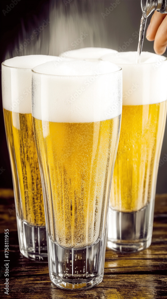 Four glasses of light beer with foam head on wooden table. Cold refreshing craft lager with bubbles and golden color in transparent pints against dark rustic background. #1758111955