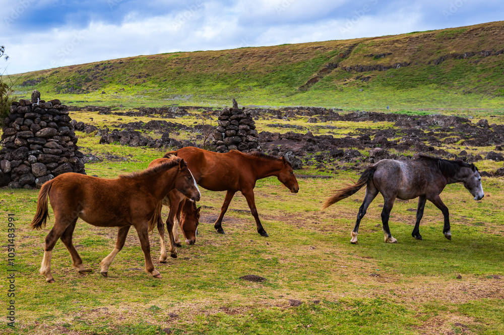 Free roaming wild horses walking in springtime near the stone ruins of Rapa Nui ancient houses and ruins on Easter Island in the meadows beneath the volcano Ranu a Raraku a Unesco World Heritage Site #1031483991