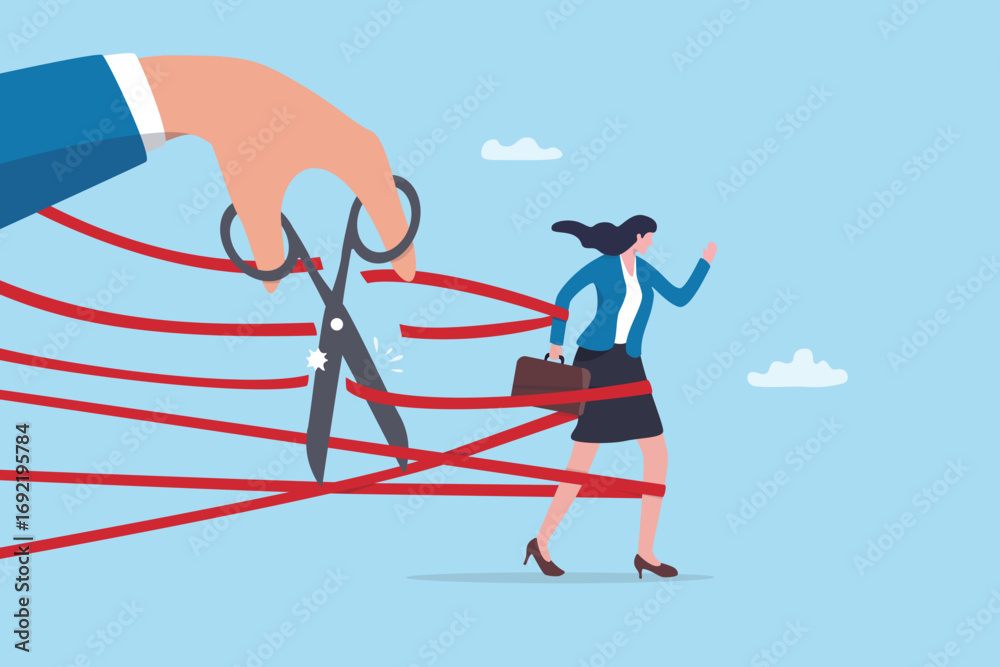 Freedom or challenge of gender inequality, struggle or inspiration, release full potential, unlock skill for new opportunity concept, businesswoman cut red rope to unlock or release from struggle. #1692195784