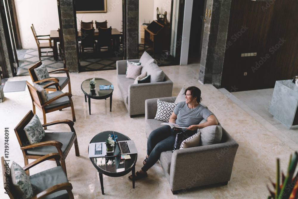 Freelancer relaxing with book in coworking lounge, laptop and charts nearby, balancing digital productivity with mindful offline pause in elegant workspace. #1719748091
