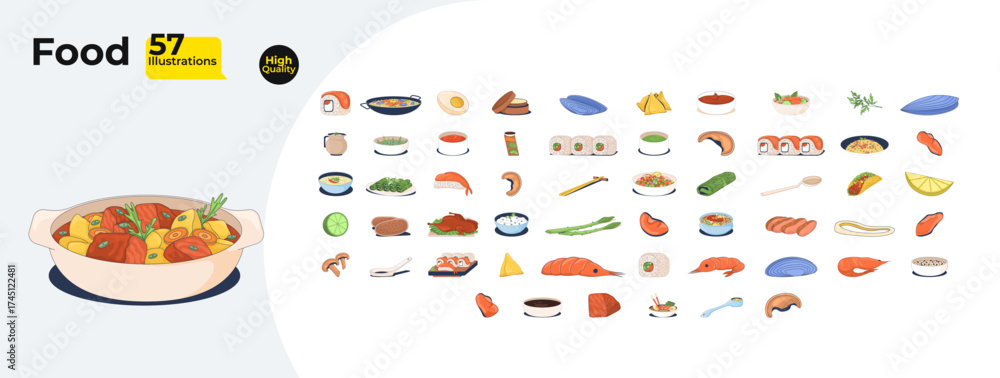 Fresh food and cuisine ingredients cartoon flat illustrations mega bundle. Sushi, vegetables, seafood. Sauces, cooking elements 2D images isolated on white. Collection vector drawings colorful #1745122481