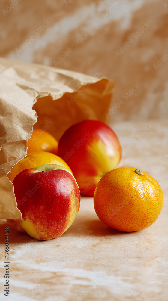 Fresh red and yellow apples in a paper bag on marble surface, symbolizing organic food, natural harvest, healthy lifestyle and freshness concept. #1765056928