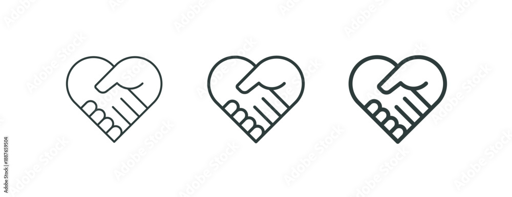 Friendly agreement handshake partnership deal, corporate trust contract thin outline icon. Minimalist line symbol heart shape made from two shaking hands. Vector isolated pictogram for web and app. #1887659504