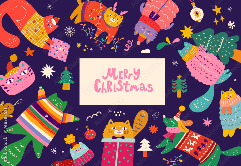 Funny greeting Merry Christmas illustration with funny cats and gifts. Greeting holiday card #1766583531