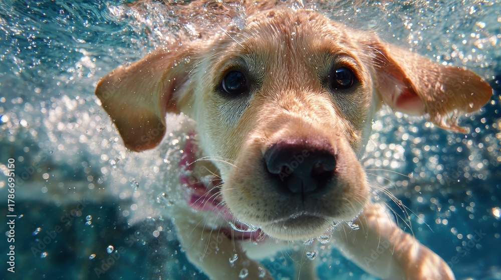 Funny underwater picture of puppies in swimming pool playing deep dive action training game with family pets and popular dog breeds during summer holidays. recreation, relax, generate by AI #1786695150