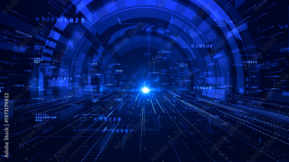 Futuristic blue digital tunnel with glowing data lines and network interface elements, representing cyber technology, big data, AI systems, and high-speed digital communication. 3d rendering #1973179822