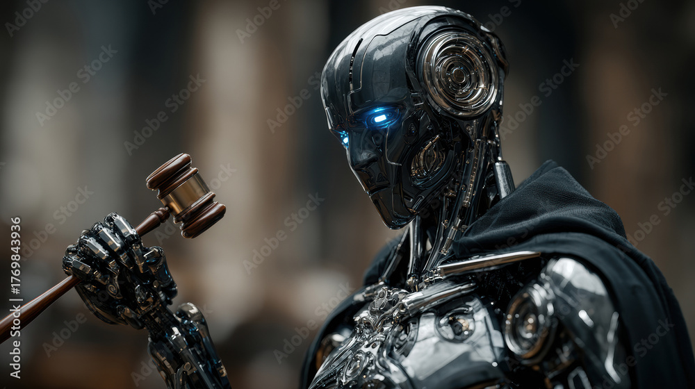 Futuristic courtroom scene with ai robot acting as judge in legal setting #1769843936