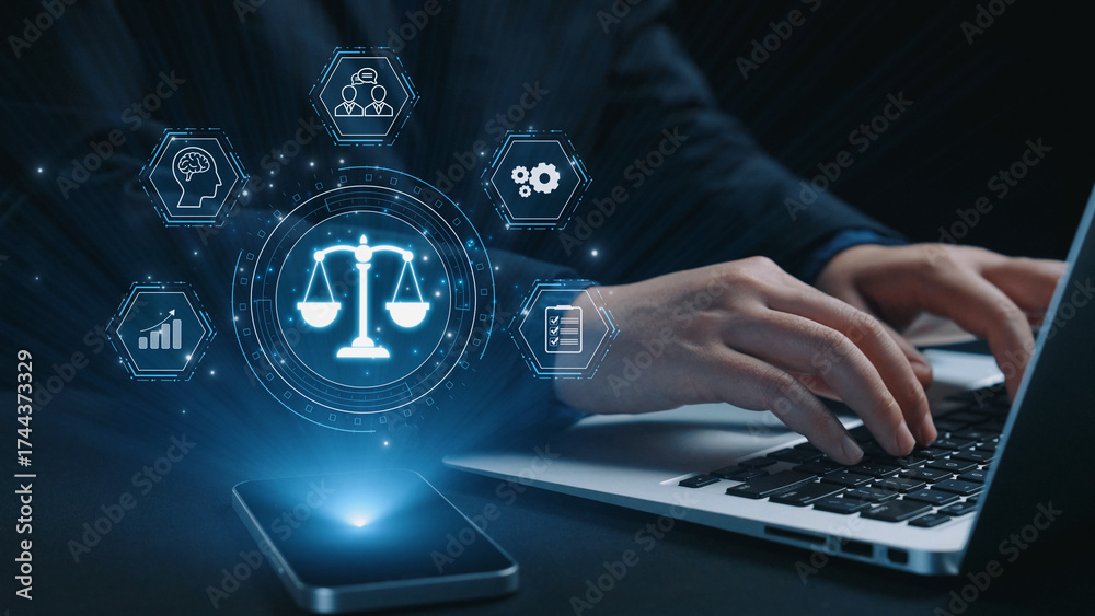 Futuristic digital law interface displaying justice scale, highlighting digital law, AI compliance, digital law systems, and digital law regulations for secure governance. Elide #1744373329