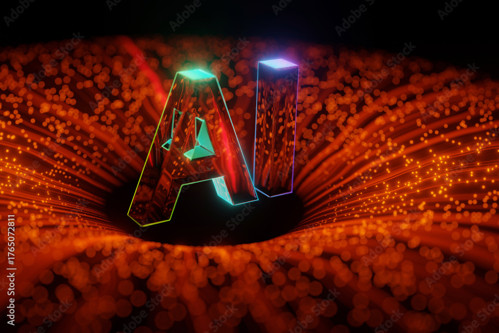 Futuristic glowing neon AI letters surrounded by digital light trails, representing artificial intelligence, innovation, data technology, and the power of modern machine learning. #1765072811