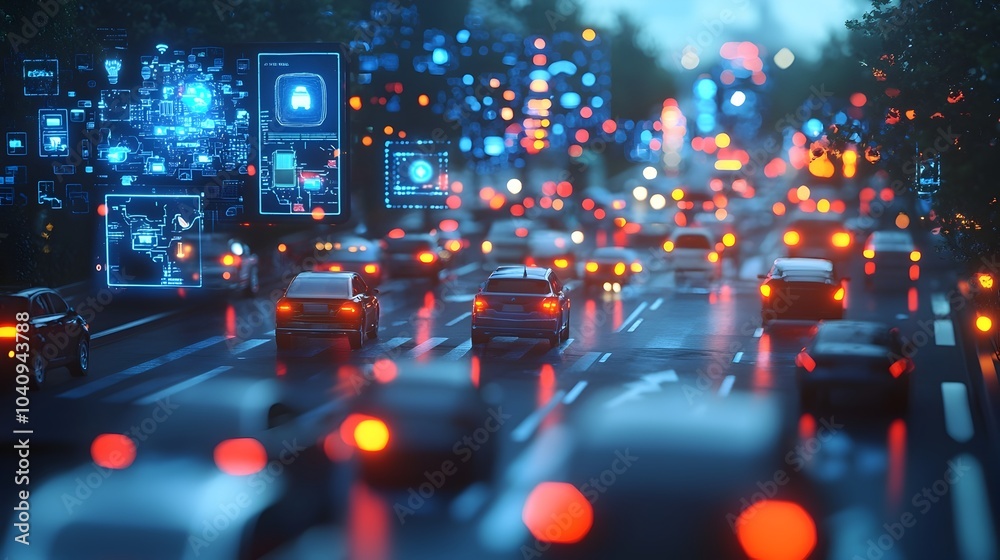 Futuristic smart city traffic management system with holographic screens displaying real time vehicle tracking emergency vehicle routing #1040943788