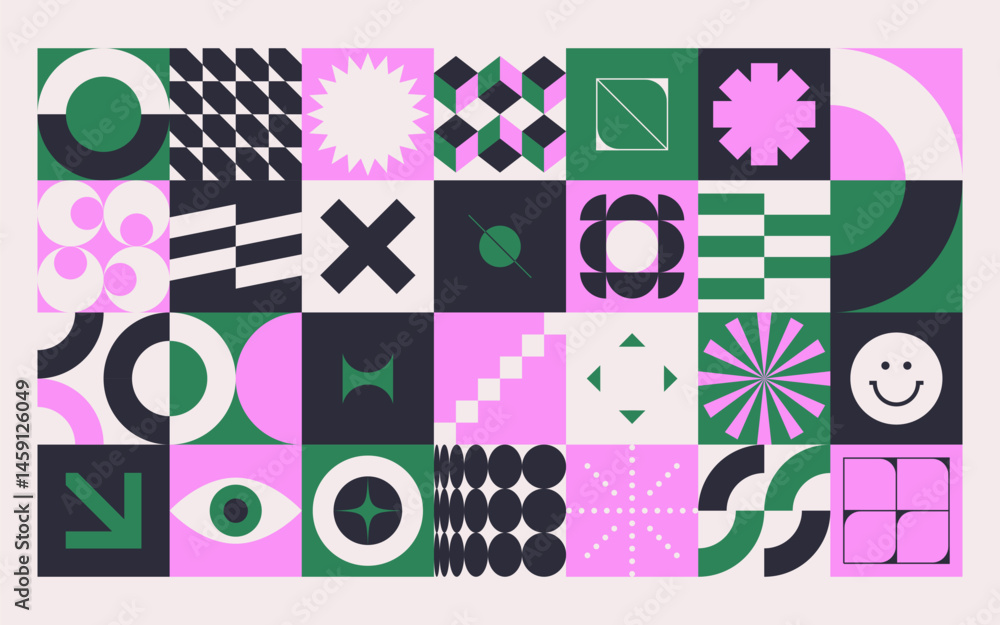 Geometric abstract shapes. Bauhaus geometry pattern minimal modern primitive geometric forms, simple geometrical brutalism swiss art elements. Vector set #1459126049