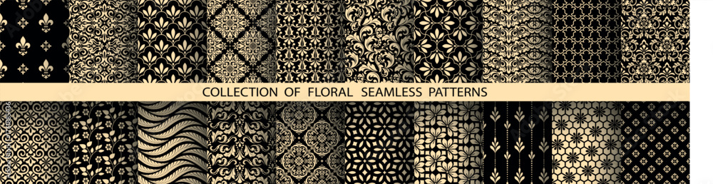 Geometric floral set of seamless patterns. Golden and black vector backgrounds. Damask graphic ornaments #1761885436