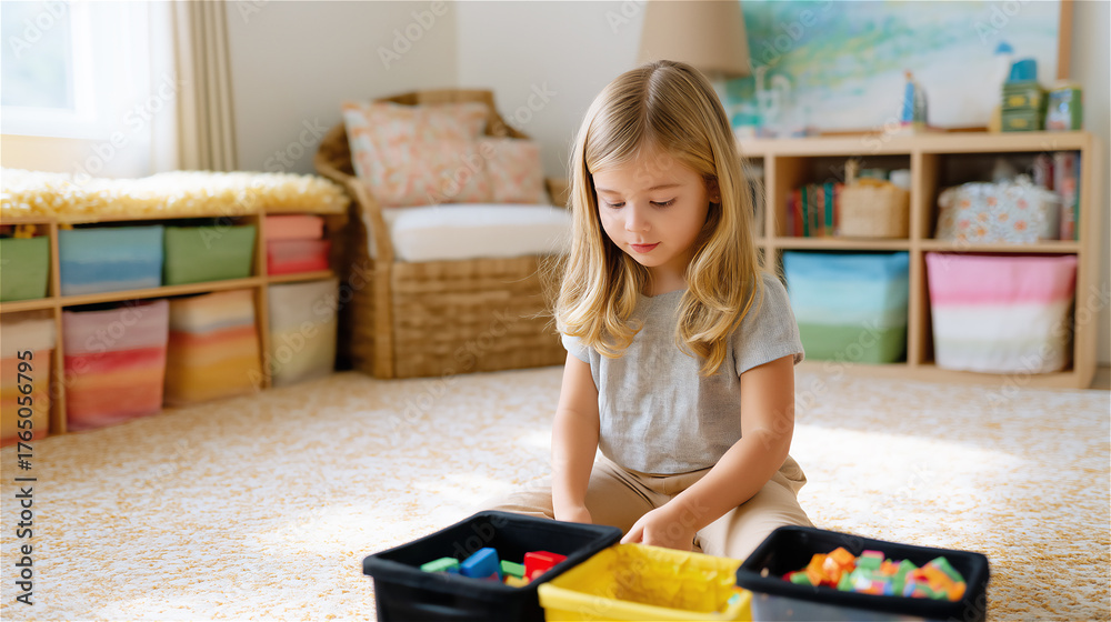Girl sitting on carpet playing with colorful educational toys, concept of learning, childhood and early development in home environment. #1765056795