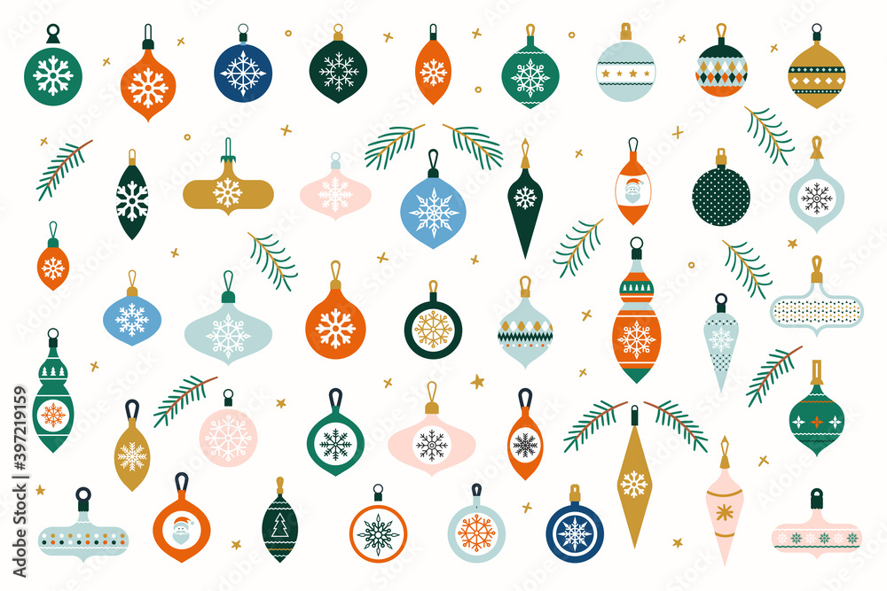 • #395085899 Christmas decorative banner. Baubles and decorations. vector in cartoon style. ollection of seasonal elements. Set of holiday ornaments. Traditional new year celebration accessories. Flat icons.