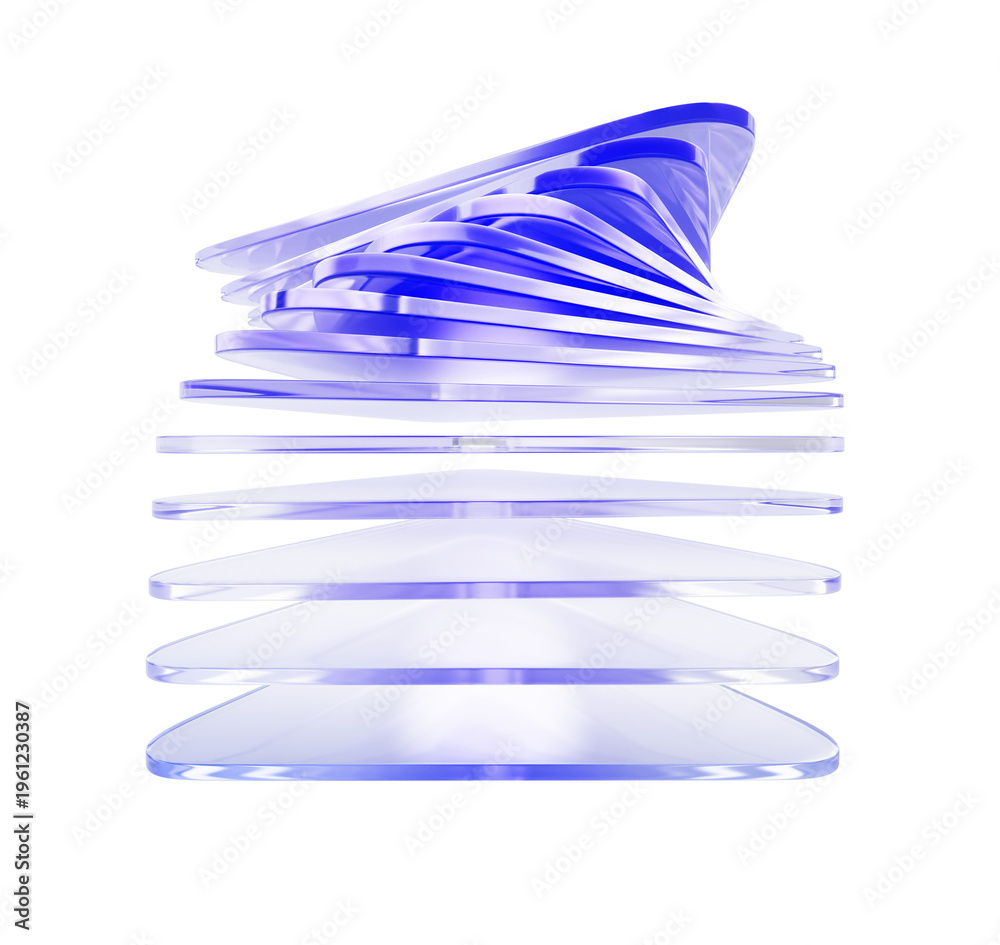 Glass layered 3d shape with twisted transparent effect, light purple gradient. Modern architecture pattern, infographic element for business presentation, futuristic tech, data array #1961230387