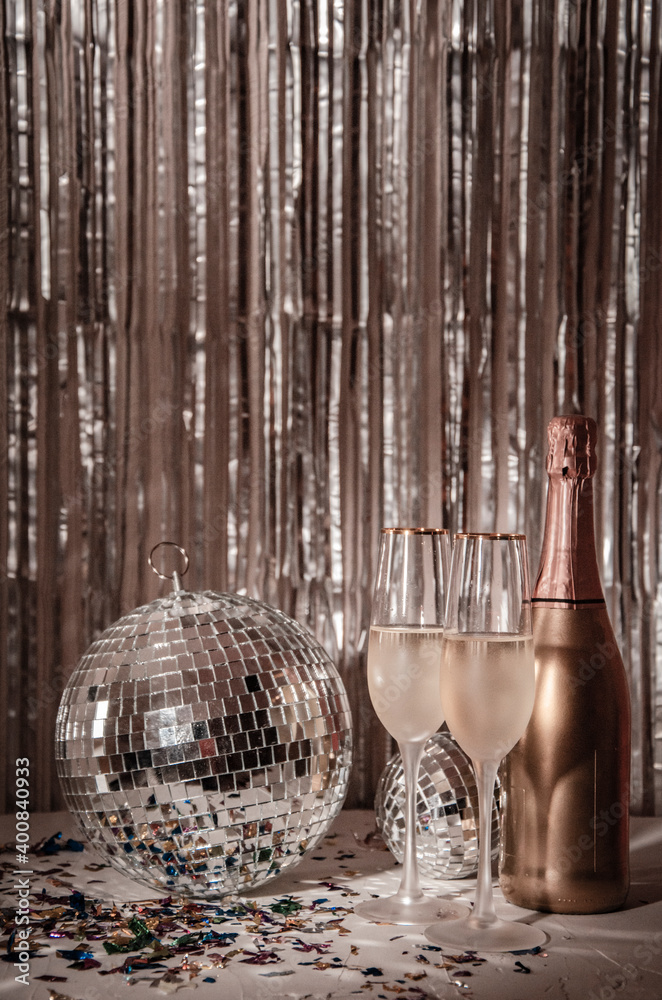 Glasses of champagne and a bottle, a disco ball on a shining gold surface. New Years Eve party background #400840933
