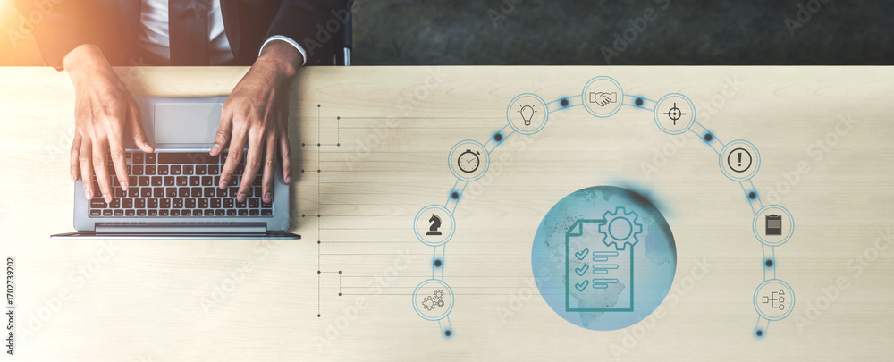 Global project management solutions and services. A strategy for business planning and execution to achieve project goals and objectives worldwide. Motif #1702739202