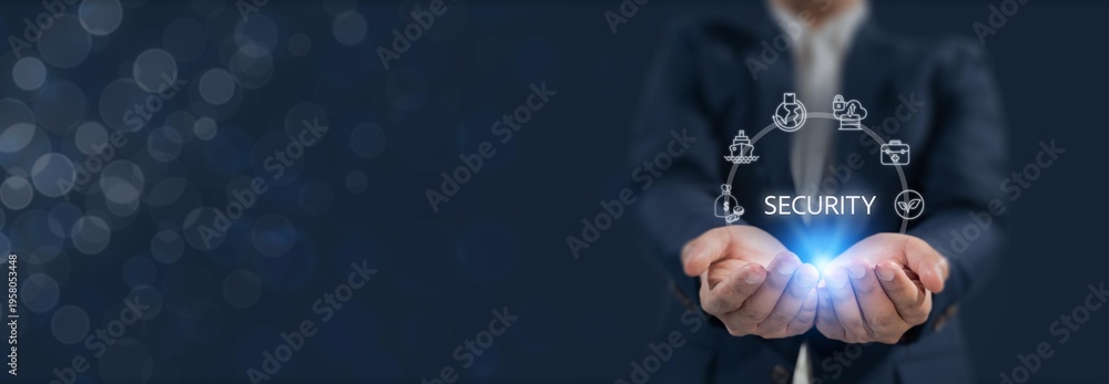 Global security economy and Risk management concept. Holding digital security icons representing global security economy, risk management, protection systems, economic stability in a connected world. #1958053448