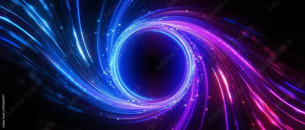 Glowing swirling vortex of vibrant light trails in blue, purple and pink color on a dark background. Concept of big data, block chain and digital technology. Template with free copy space for text. #1493665977