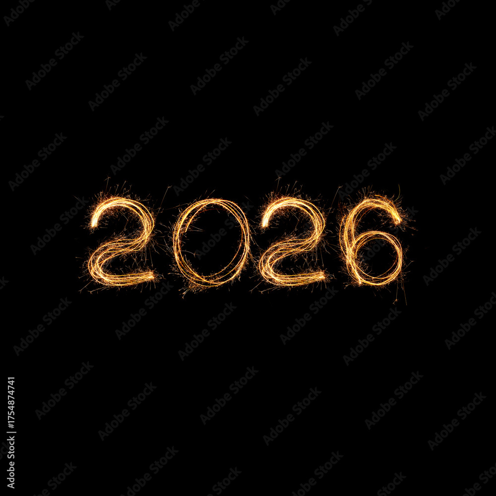 Glowing “2026” written with sparkler light on a dark background, representing New Year celebration, fireworks, and festive energy. Ideal for holiday, party, and celebration concepts. #1754874741