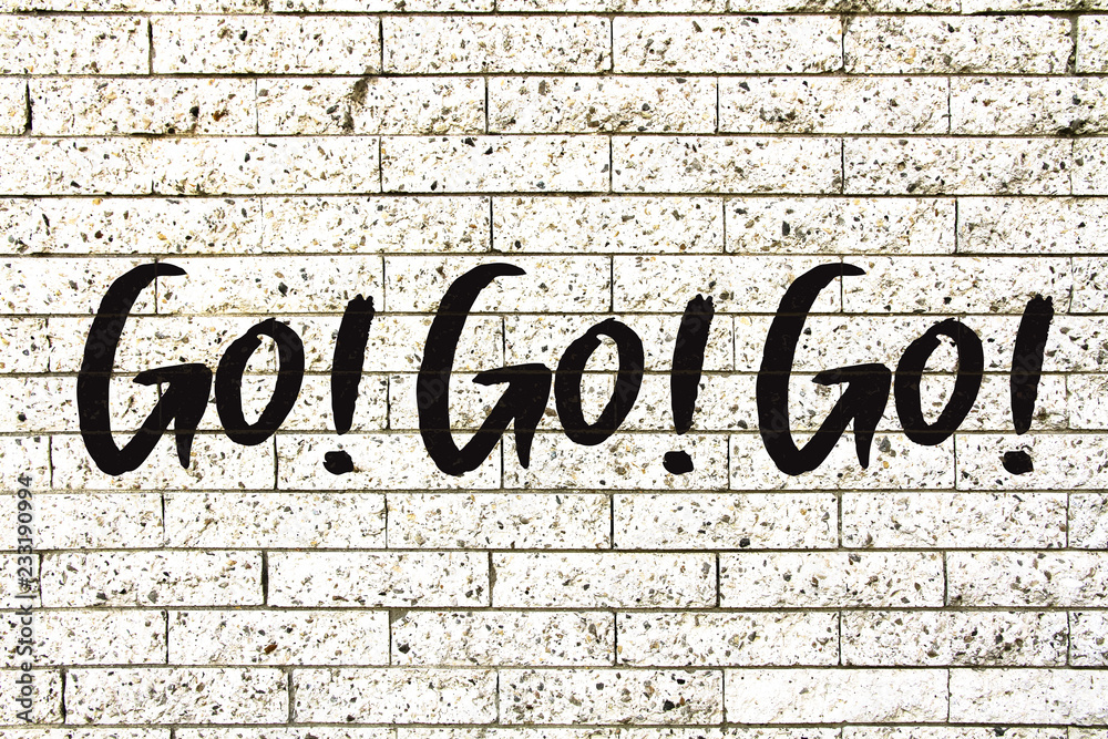 “Go! Go! Go!” motivational text written on a white stone brick wall background. #233190994