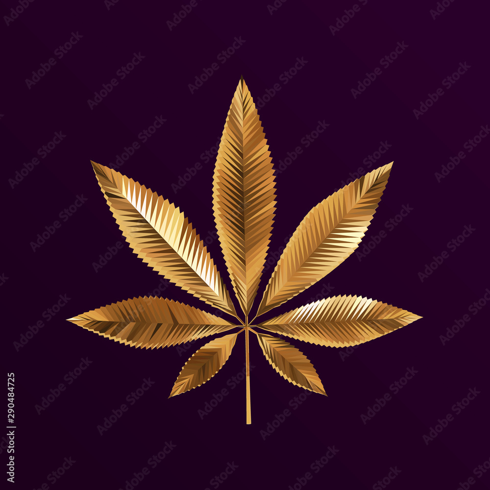 Gold Cannabis Leaf on Purple Background. Shiny Metallic Golden Low Poly Vector 3D Rendering #290484725