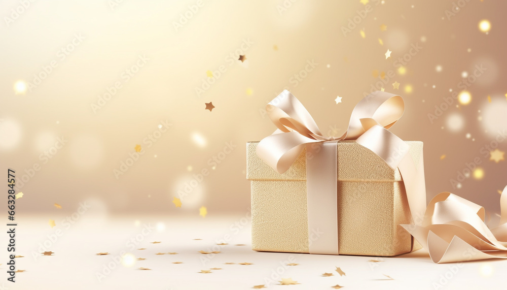 gold gift box with ribbon and bow on beige background with empty copy space #663284577