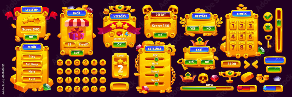 Golden game interface with jewelry shop, golden menu, victory defeat screen and game levels, vector UI. Cartoon progress bar and score panel with shiny gold buttons and gems, game interface asset #1807088125