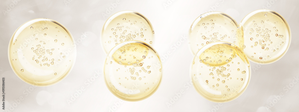 Golden oil drop texture with bubble 3d render icon set. Yellow liquid collagen gel sphere, gold serum circle stain top view. Keratin cosmetic fluid puddle on light beige background. 3D illustration #1915086403