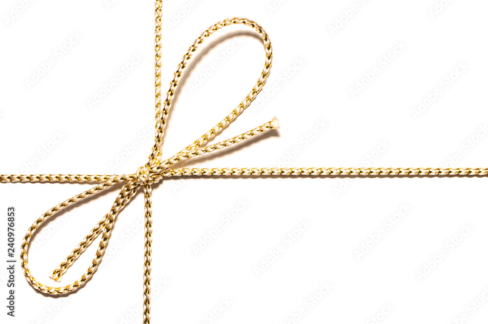 Golden satin rope with knotted bow gift ribbon wrap for Christmas present with intricate shine details isolated cut out on simple plain white background. #240976853