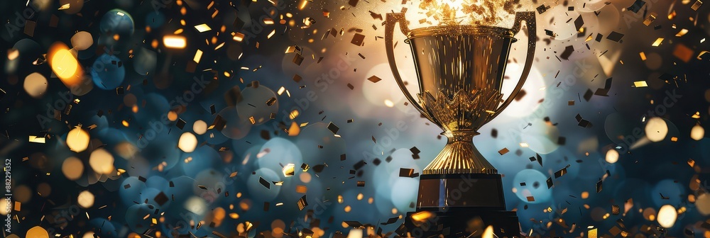 Golden trophy with confetti and glowing particles on dark blue background #882291352