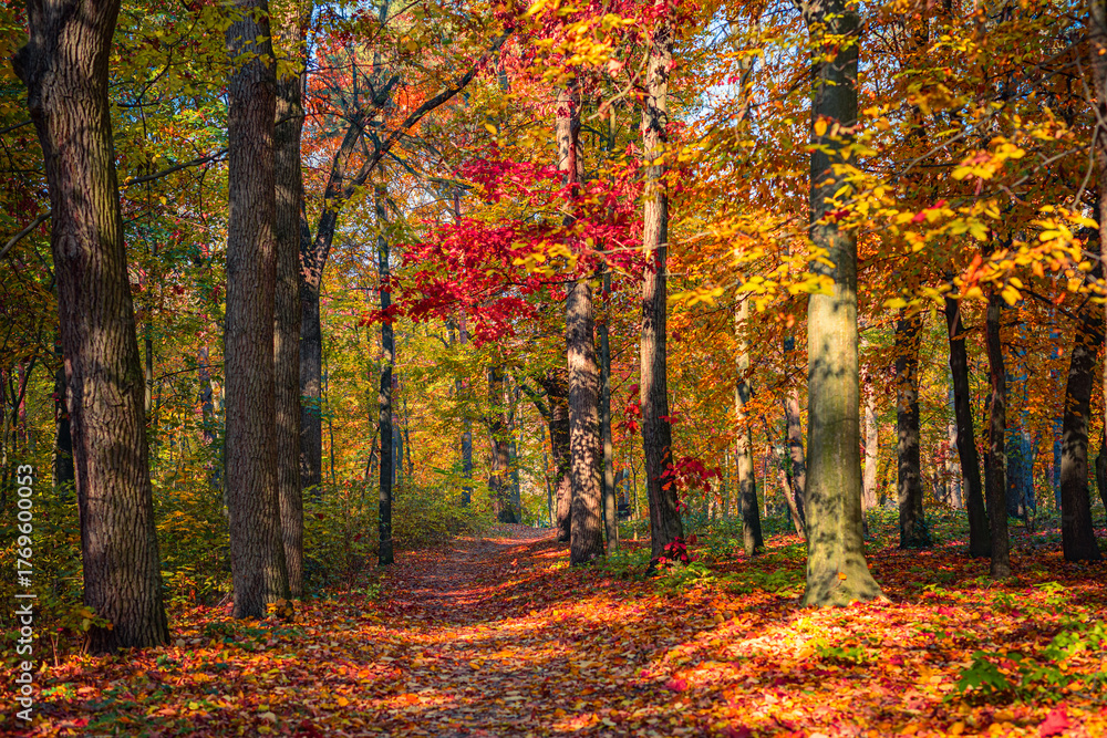Gorgeous Autumn Forest Trail Landscape with Seasonal Nature Background for Wall Art. Stunning Closeup Colorful Leaves showcase Vibrant Fall Colors. Tranquil Path Scenic Beauty. Perfect Outdoors Nature #1769600053