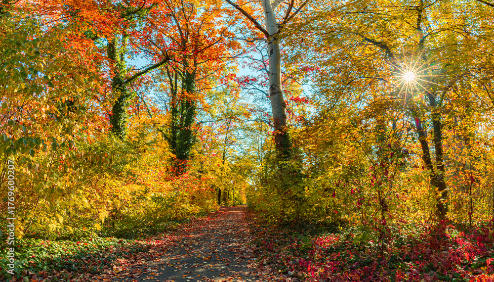 Gorgeous Autumn Forest Trail Landscape with Seasonal Nature Background for Wall Art. Stunning Closeup Colorful Leaves showcase Vibrant Fall Colors. Tranquil Path Scenic Beauty. Perfect Outdoors Nature #1769600207