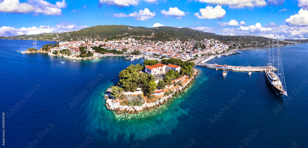 Greece travel destination scenic places - Skiathos island, Sporades. Popular tourist attraction - tradiotional old town , aerial drone panoramic view of Bourtzi peninsula and harbour #1585041290