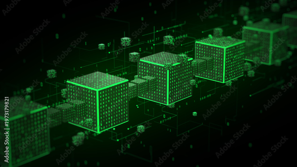 Green blockchain cubes connected in a digital network, symbolizing distributed ledger technology, secure data storage, cryptocurrency systems, and decentralized digital infrastructure. 3d rendering #1973179821