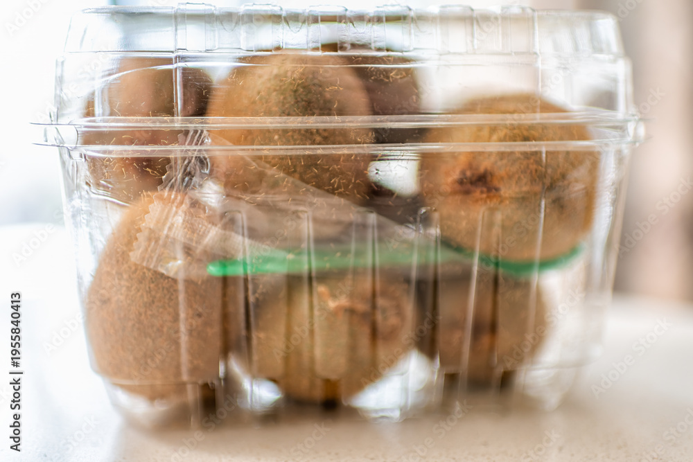 Green fuzzy kiwi fruit in plastic container box from store supermarket macro closeup #1955840413