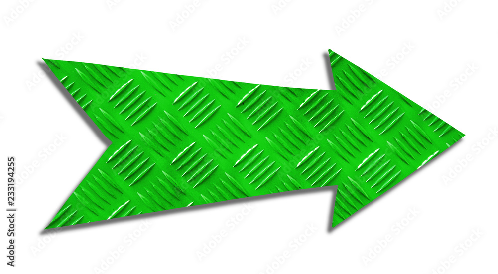 Green metallic iron direction arrow sign with steel checker plate (or diamond plate) industrial metal texture pattern cut out isolated on a white background. #233194255