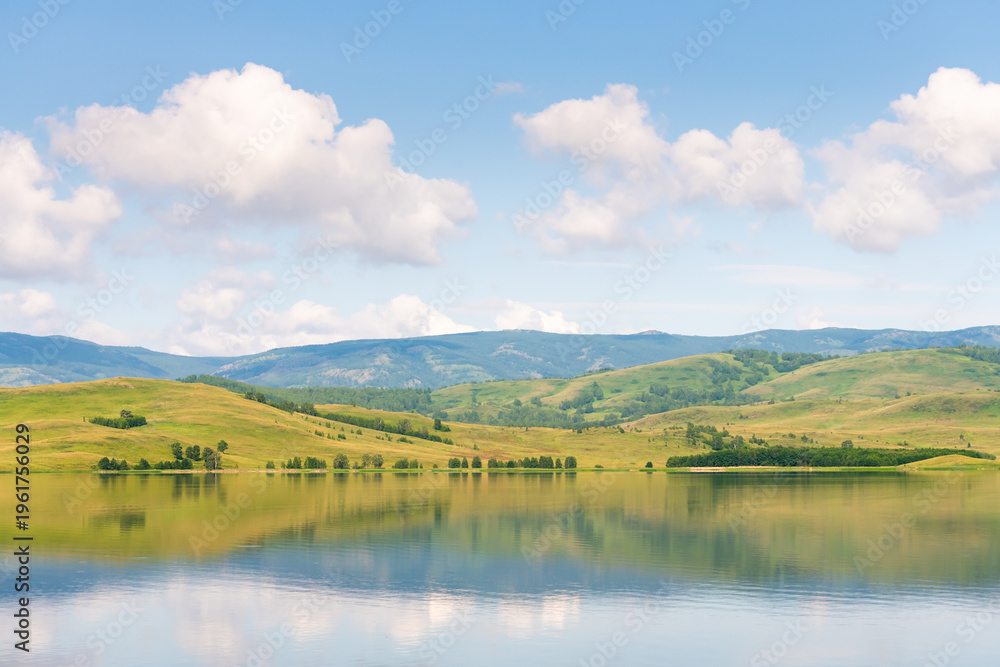 Green mountains and the blue sky with clouds are reflected in the lake. Beautiful summer landscape. #1961756029