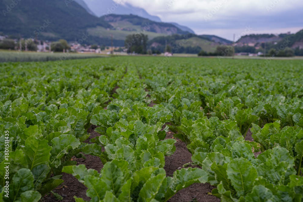 Green sugar beet field near Saint-Maurice, Switzerland, stretches across the fertile Rhone Valley. Young plants grow in neat rows under cloudy skies with village houses in the background. #1801511435