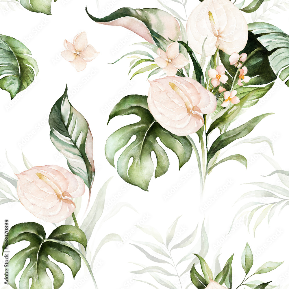 Green tropical leaves and blush flowers on white background. Watercolor hand painted seamless pattern. Floral tropic illustration. Jungle foliage. #358070899